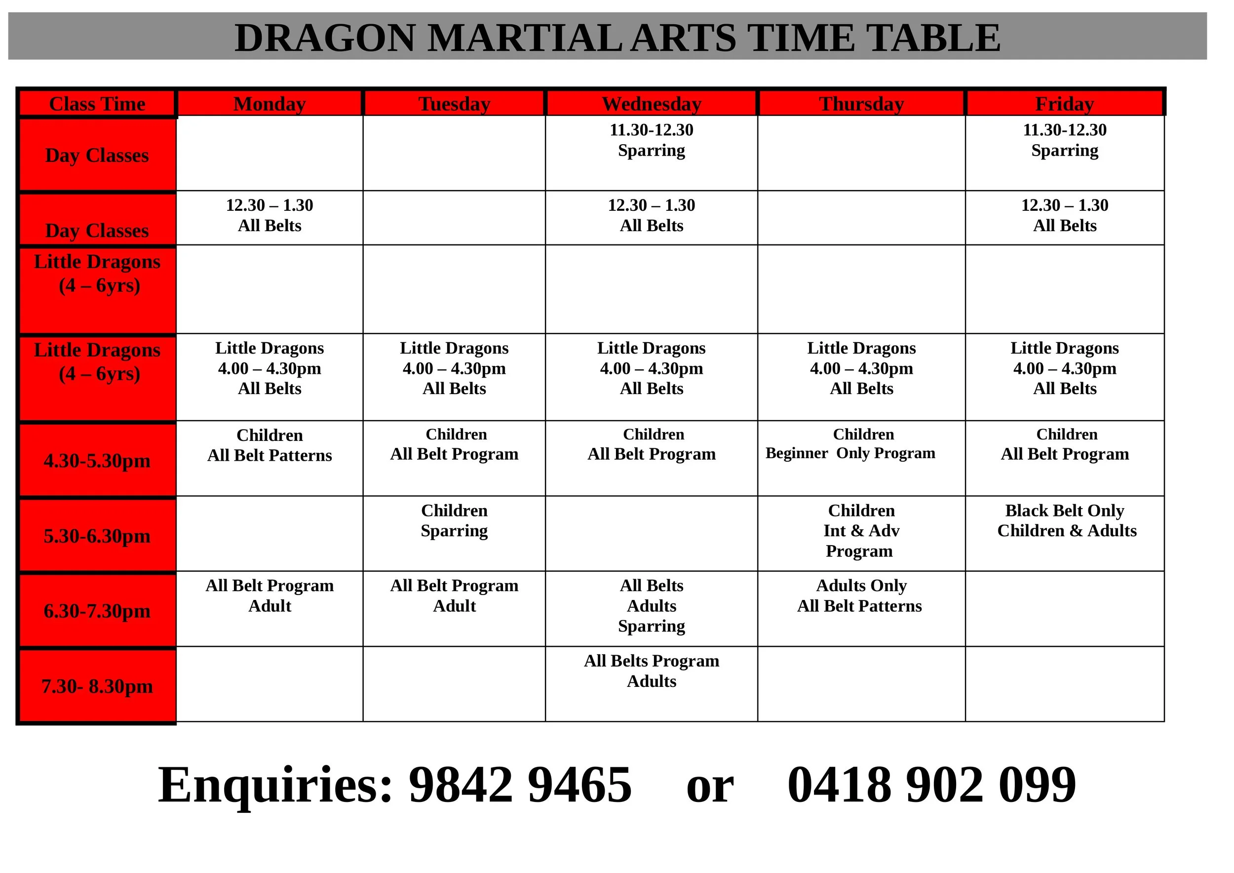 Dragon Timetable 2025